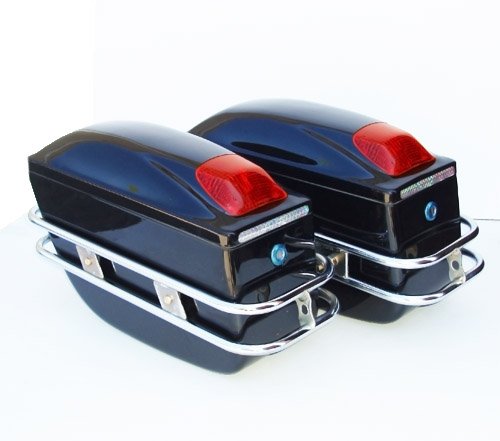This is a pair of beautiful motorcycle hard saddlebags. These bags have build-in brake lights that can be wired with your bike. Our hard saddlebags are made of NON-RECYCLED high quality ABS and they are more durable and last much longer than those made of cheap recycled plastics. These Great Saddlebags Feature: - The outer dimension for each bag: 16" L x 10 1/2" H x 6 1/3" W - Pre-wired brake lights - Comes with chrome coated steel frame and 4 strips for easy mounting. - Nice glossy black finish - Lockable with 2 keys